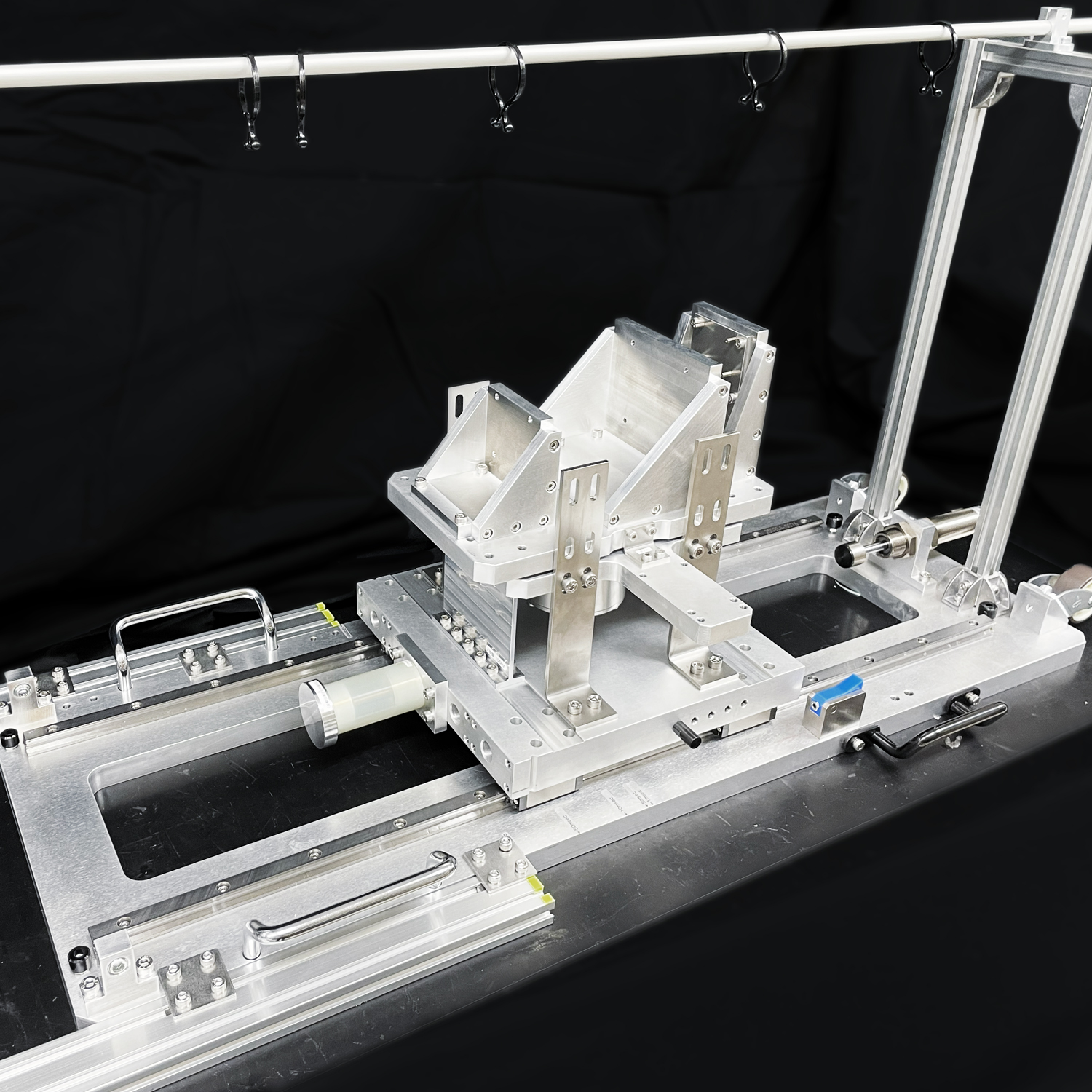慣性計測ユニット(IMU)評価のための試験治具の設計・製作を行いました。 IMUの衝撃・振動に対する発生誤差の程度を測定・評価するための試験治具です。 IMUを設置した土台に錘をぶつけることで衝撃・振動を与えており、そのエネルギーは錘を振り上げる角度によって調整可能です。同時に複数個のIMUを搭載可能で、X,Y,Z各軸の測定ができるようアタッチメントを付属しています。