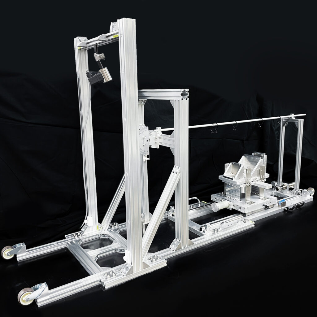 YUKI Precision designed and manufactured a test jig for evaluating an inertial measurement unit (IMU). This fixture measures and evaluates the degree of error generated by the IMU when subjected to shock and vibration. By striking weights against the base where the IMU is mounted, shock and vibration are applied; the energy can be adjusted by the angle at which the weights are swung. It can simultaneously mount multiple IMUs and includes attachments enabling measurement of each X, Y, and Z axe.